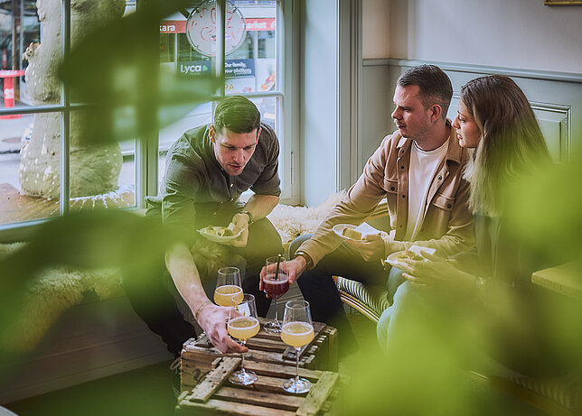 Bar, Restaurant & Lounge: Das Herzstück deiner Veranstaltung. Eine offene Bar mit langer Theke, bequemen Barhockern und antiken Lounge-Möbeln bietet den idealen Treffpunkt für gesellige Momente. Helle Fensterfronten und eine warme Beleuchtung verleihen dem Raum eine einladende Gemütlichkeit.