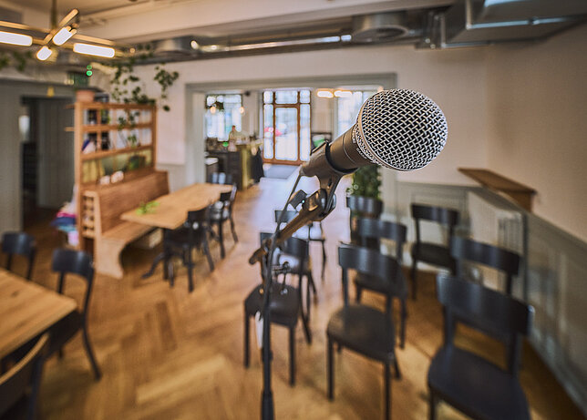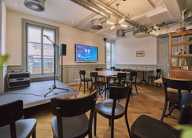 Multifunktionale Bühne: Perfekt für Präsentationen, Vorträge, kleine Konzerte oder Lesungen. Die flexible Bühne kann angepasst oder abgebaut werden und bietet eine ideale Plattform für deine Inhalte.