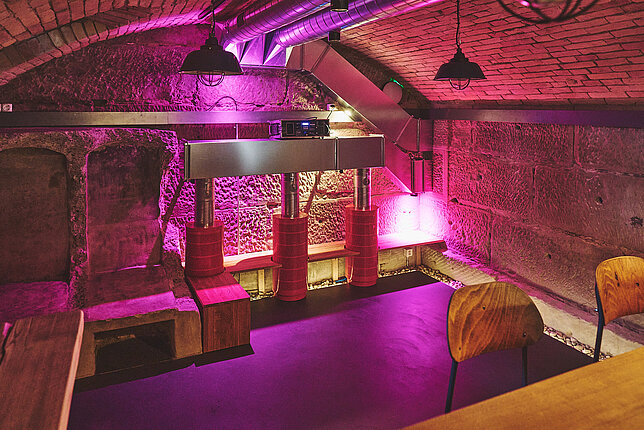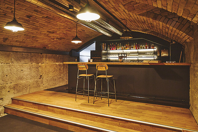 Gewölbekeller: Dieser moderne Gewölbekeller vereint rustikale Eleganz mit zeitgemässem Design: Die kunstvoll freigelegte Sichtbacksteindecke verleiht dem Raum eine warme, authentische Atmosphäre. Im Mittelpunkt steht eine stilvolle Bar, deren klare Linien und hochwertige Materialien das urbane Flair unterstreichen.